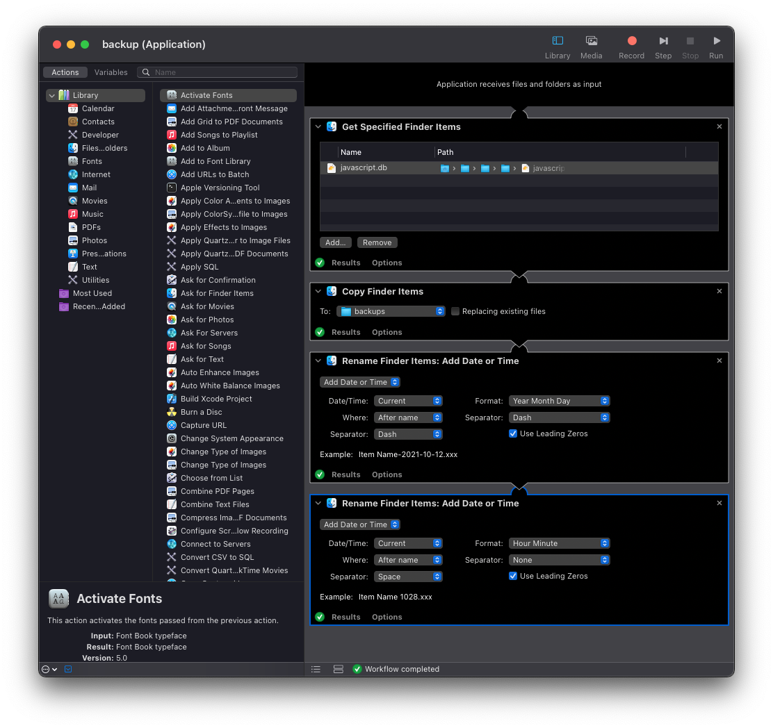 and I set it up like this, to get the file I wanted to back up, copy it to a backups folder, and add the date and time: