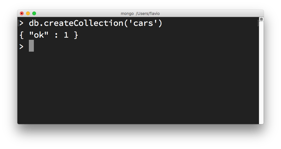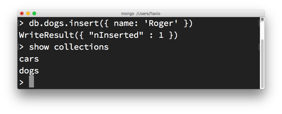 You can also create a new collection by using it as a property of the db object, and calling insert() to add an object to the collection: