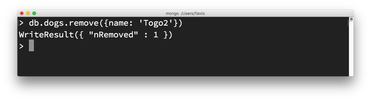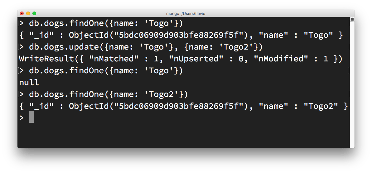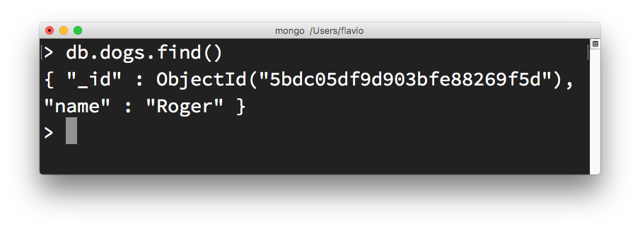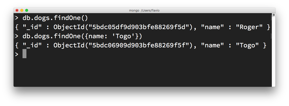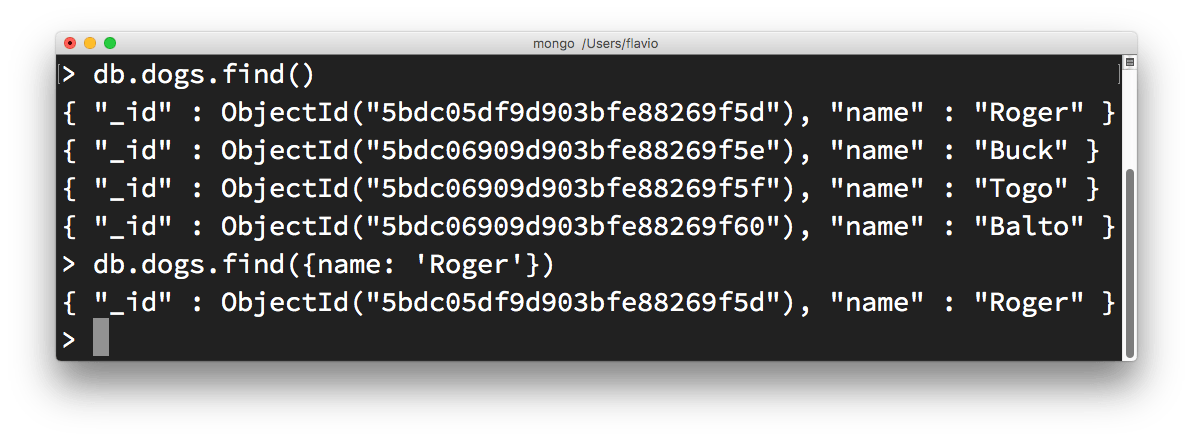 Calling db.dogs.find() will give us all the entries, while we can pass a parameter to filter and retrieve a specific entry, for example with db.dogs.find({name: 'Roger'}):