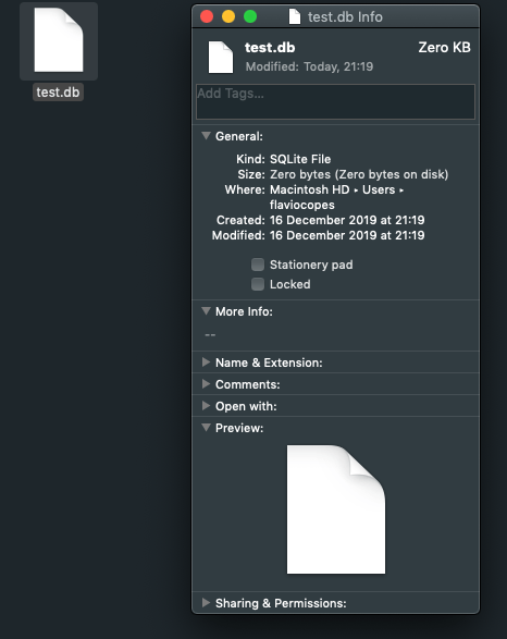 You select a name, and type a database path. I choose test.db, in the /Users/flaviocopes/ folder: