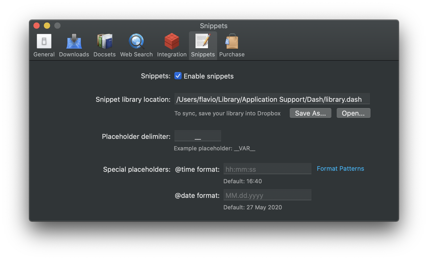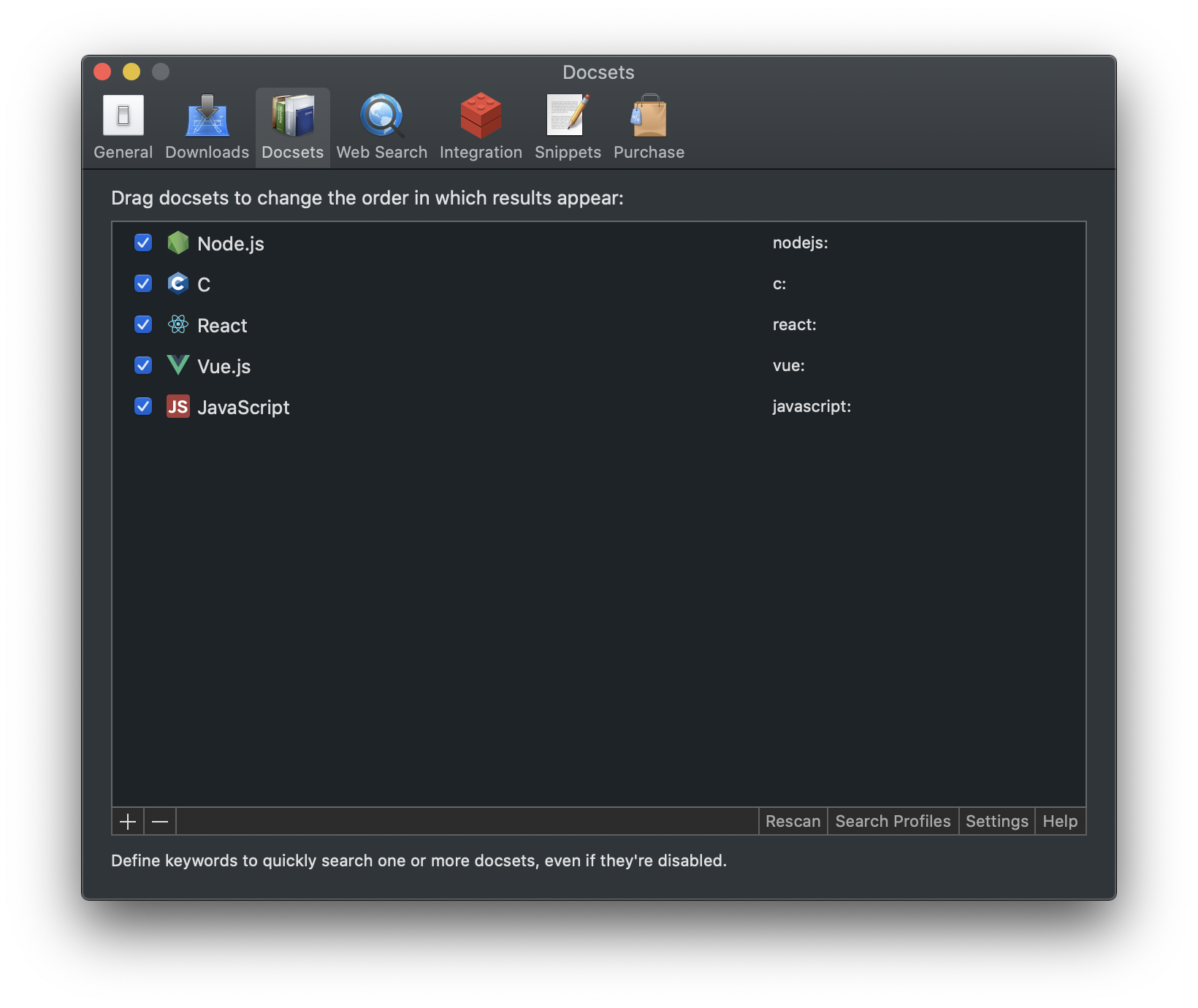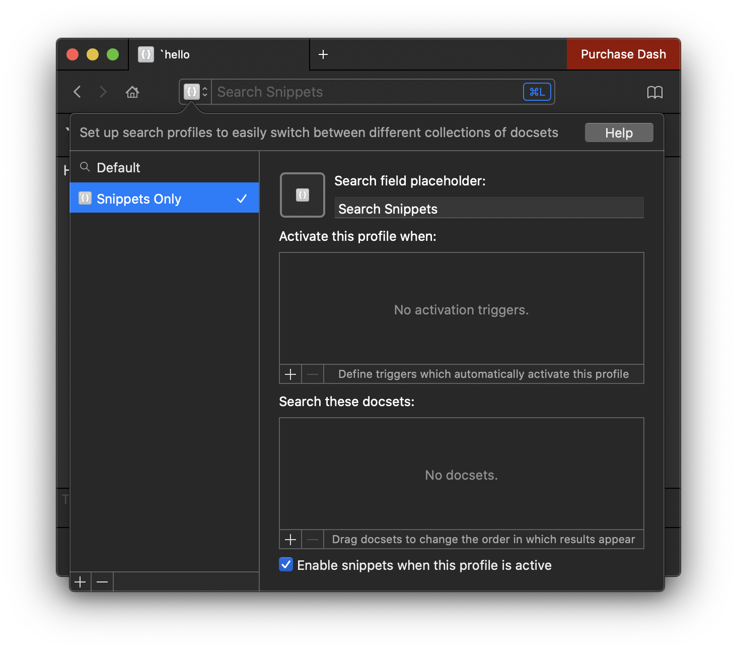 Once you have many code snippets, you’ll want to set up a search profile, so you can search just snippets instead of also searching in all the docsets you installed, to find them more easily.