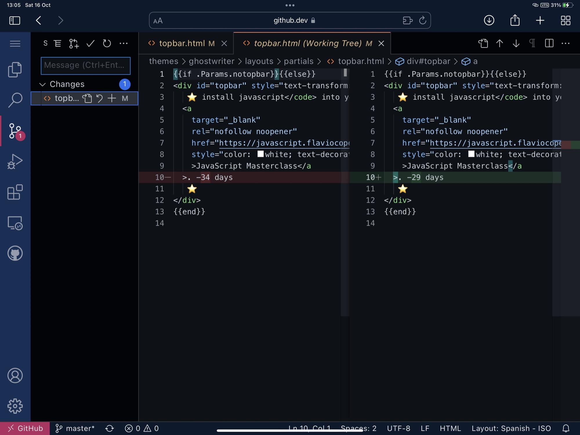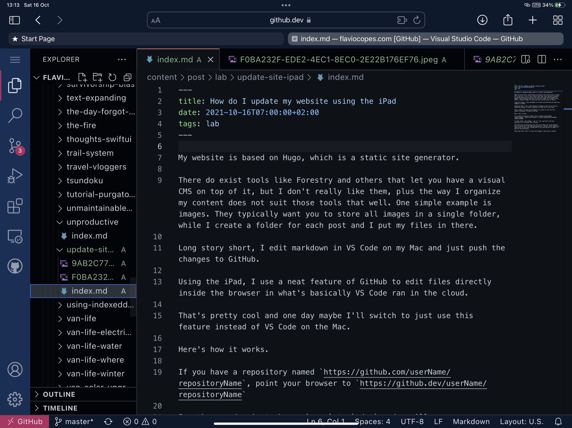 Using the iPad, I use a neat feature of GitHub to edit files directly inside the browser in what’s basically VS Code ran in the cloud.