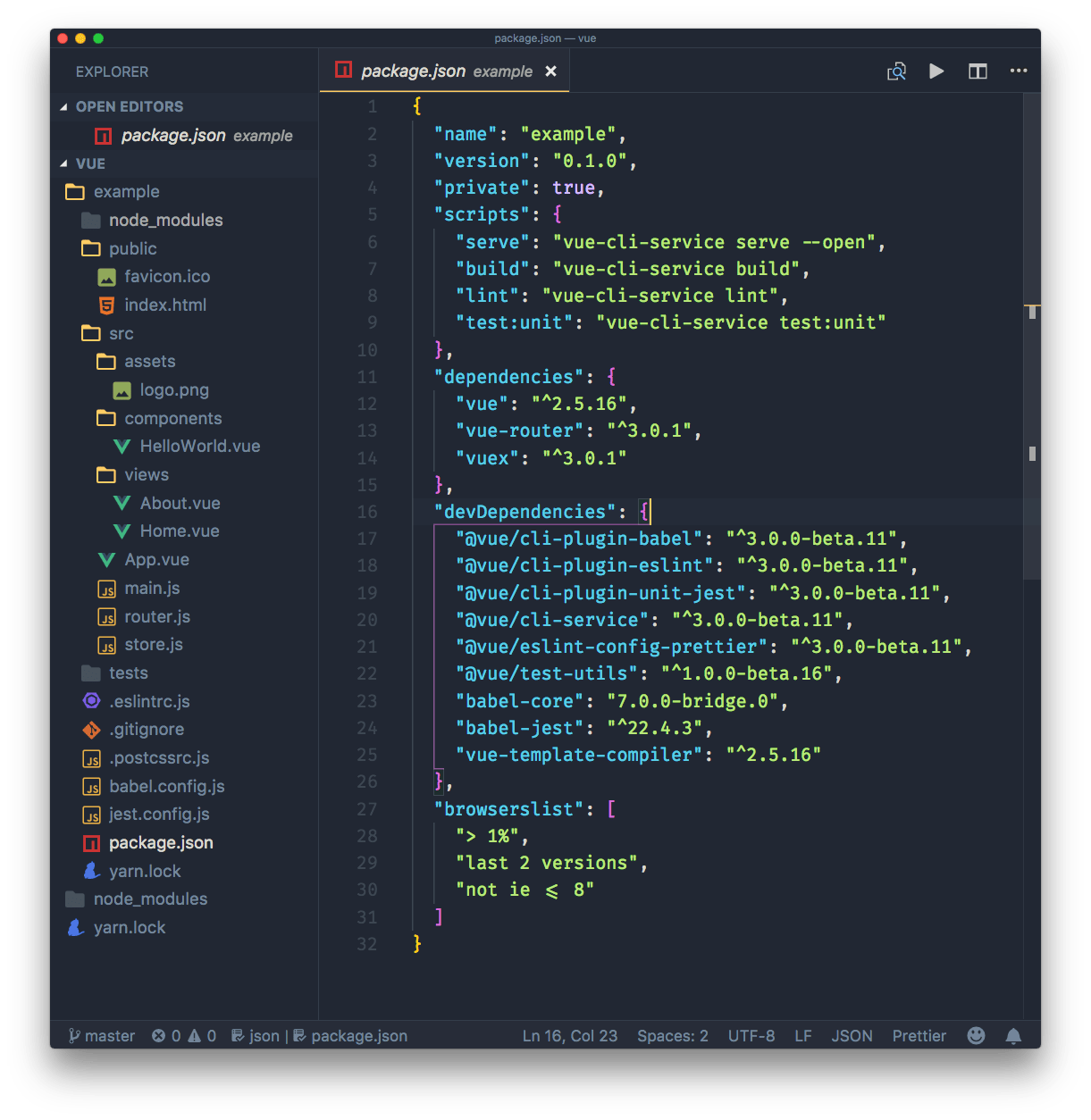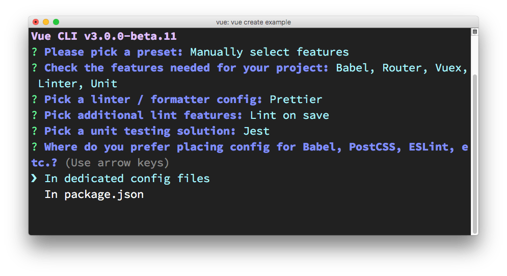 Vue CLI asks me where to put all the configuration: if in the package.json file, or in dedicated configuration files, one for each tool. I chose the latter.