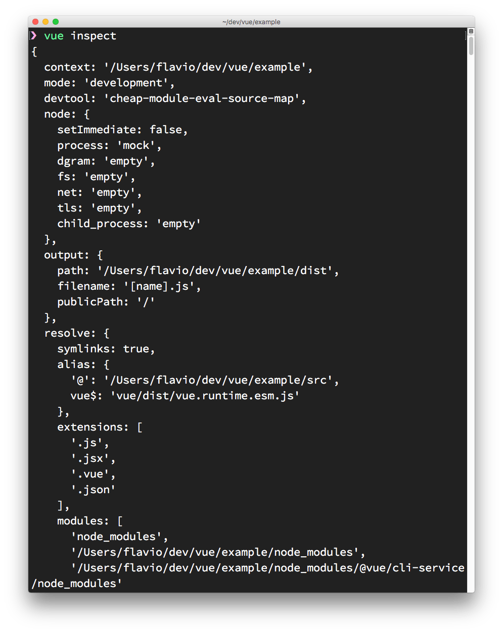 Internally, Vue CLI uses webpack, but the configuration is abstracted and we don’t even see the config file in our folder. You can still have access to it by calling vue inspect: