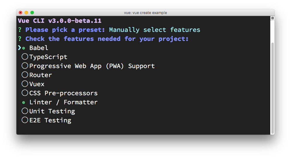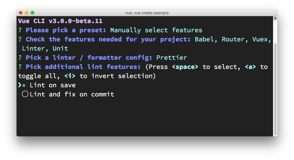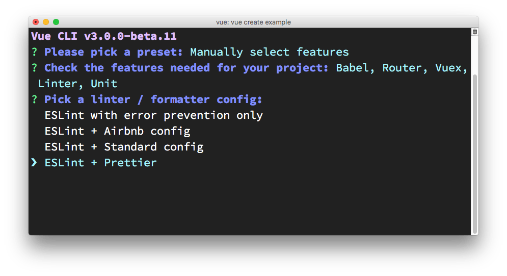 Press space to enable one of the things you need, and then press enter to go on. Since I chose a linter/formatter, Vue CLI prompts me for the configuration. I chose ESLint + Prettier since that’s my favorite setup:
