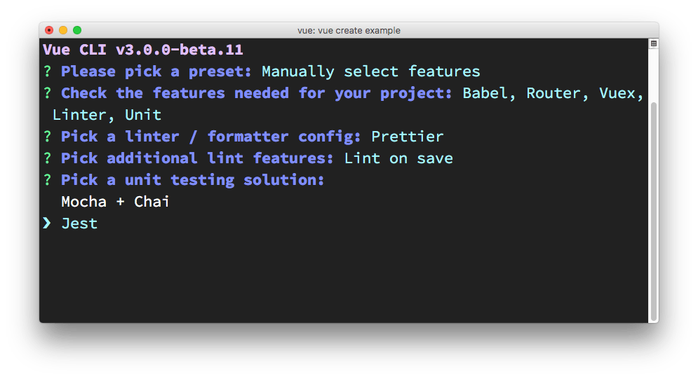 Next up: testing. I picked testing, and Vue CLI offers me to choose between the two most popular solutions: Mocha + Chai vs Jest.