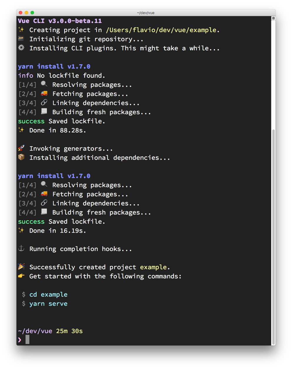 Vue CLI has created the app for us, and we can go in the example folder and run yarn serve to start up our first app in development mode: