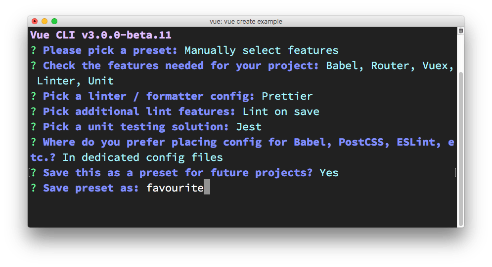 Next, Vue CLI asks me if I want to save these presets, and allow me to pick them as a choice the next time I use Vue CLI to create a new app. It’s a very convenient feature, as having a quick setup with all my preferences is a complexity reliever: