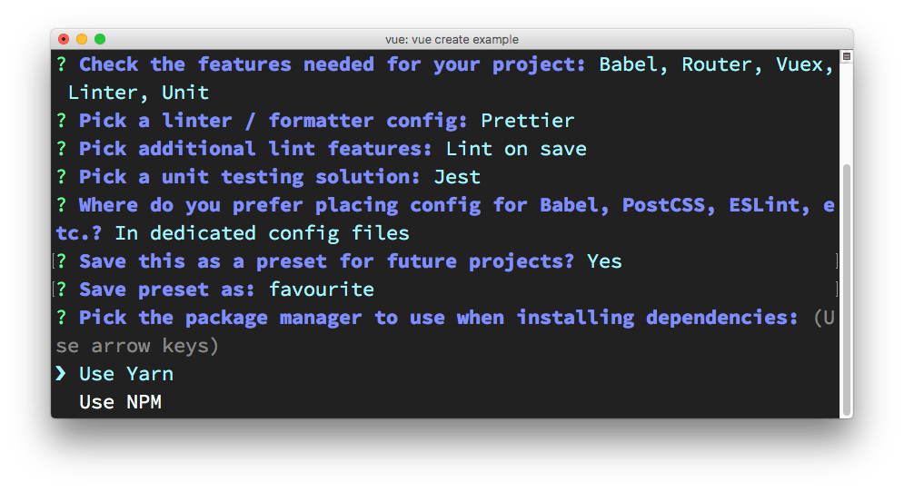 Vue CLI then asks me if I prefer using Yarn or npm:
