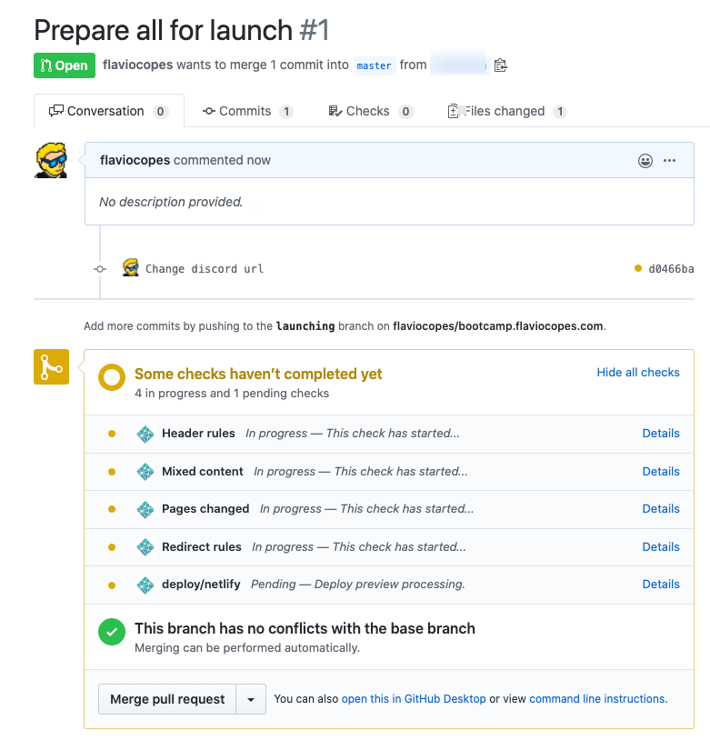 So what I did is, I created a new branch, which I called launch, and started working on it by adding a few commits, then I created a Pull Request, something that GitHub Desktop makes very easy: